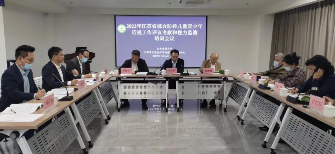 2022年11月6日下午,2022年江蘇省綜合防控兒童青少年近視工作評議考察和視力監(jiān)測培訓(xùn)會議于南京醫(yī)科大學(xué)附屬眼科醫(yī)院門診五樓會議室召開,江蘇省教育廳二級巡視員李金泉、省教育廳體衛(wèi)藝處處長張鯉鯉、省教育廳體衛(wèi)藝處二級調(diào)研員李海寧、南京市教育督導(dǎo)室原主任徐家仁、南京市教育局原體衛(wèi)藝處處長秦雯、鎮(zhèn)江市教育局原體衛(wèi)藝處處長李云芳、常州市教育局原體衛(wèi)藝處處長甘亦農(nóng)、南京醫(yī)科大學(xué)第四臨床醫(yī)學(xué)院黨委書記陸銘、南京醫(yī)科大學(xué)附屬眼科醫(yī)院院長蔣沁、南京醫(yī)科大學(xué)附屬眼科醫(yī)院主任醫(yī)師王成虎、南京醫(yī)科大學(xué)附屬眼科醫(yī)院主治醫(yī)師周云帆、省兒童青少年近視防控研究中心工作人員、評議考察和視力監(jiān)測團(tuán)隊成員等50余人參會,會議由陸銘書記主持。