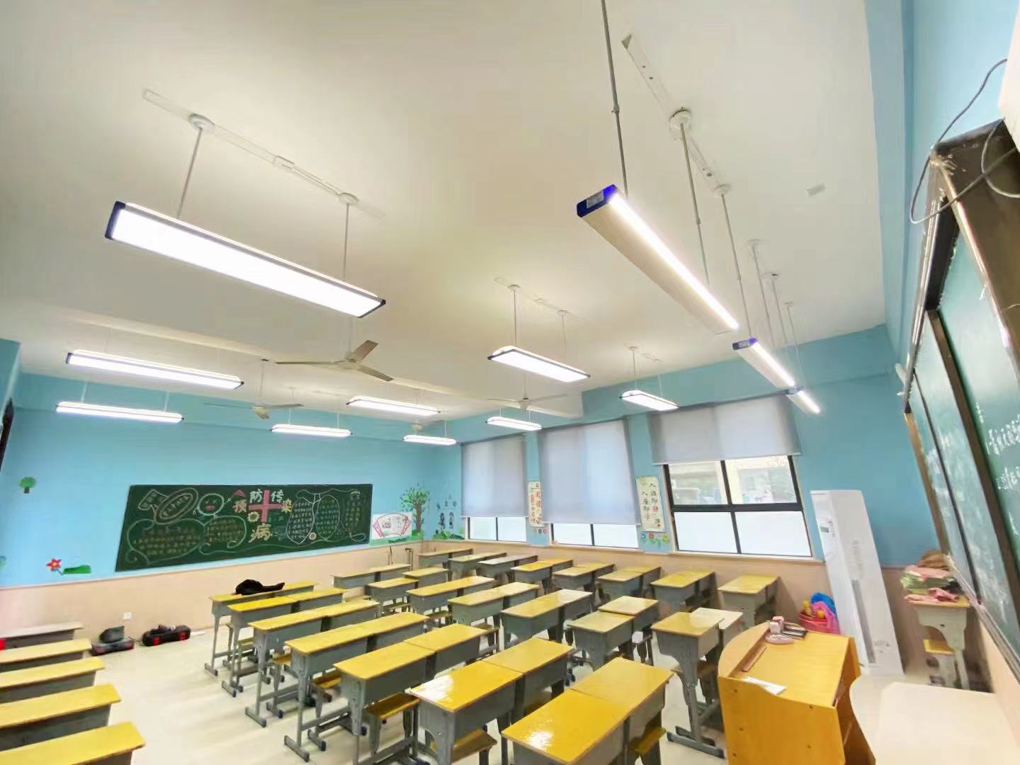 目前大部分的教室改造,采用的是“9+3”方案,即一個(gè)標(biāo)準(zhǔn)教室配備9個(gè)護(hù)眼教室燈加上3個(gè)專(zhuān)業(yè)黑板燈。在疫情之后,成才照明建議采用“9+3+2”模式:每個(gè)教室增加兩臺(tái)空氣殺菌機(jī),有效殺滅病菌,防止學(xué)生們密集交叉感染。