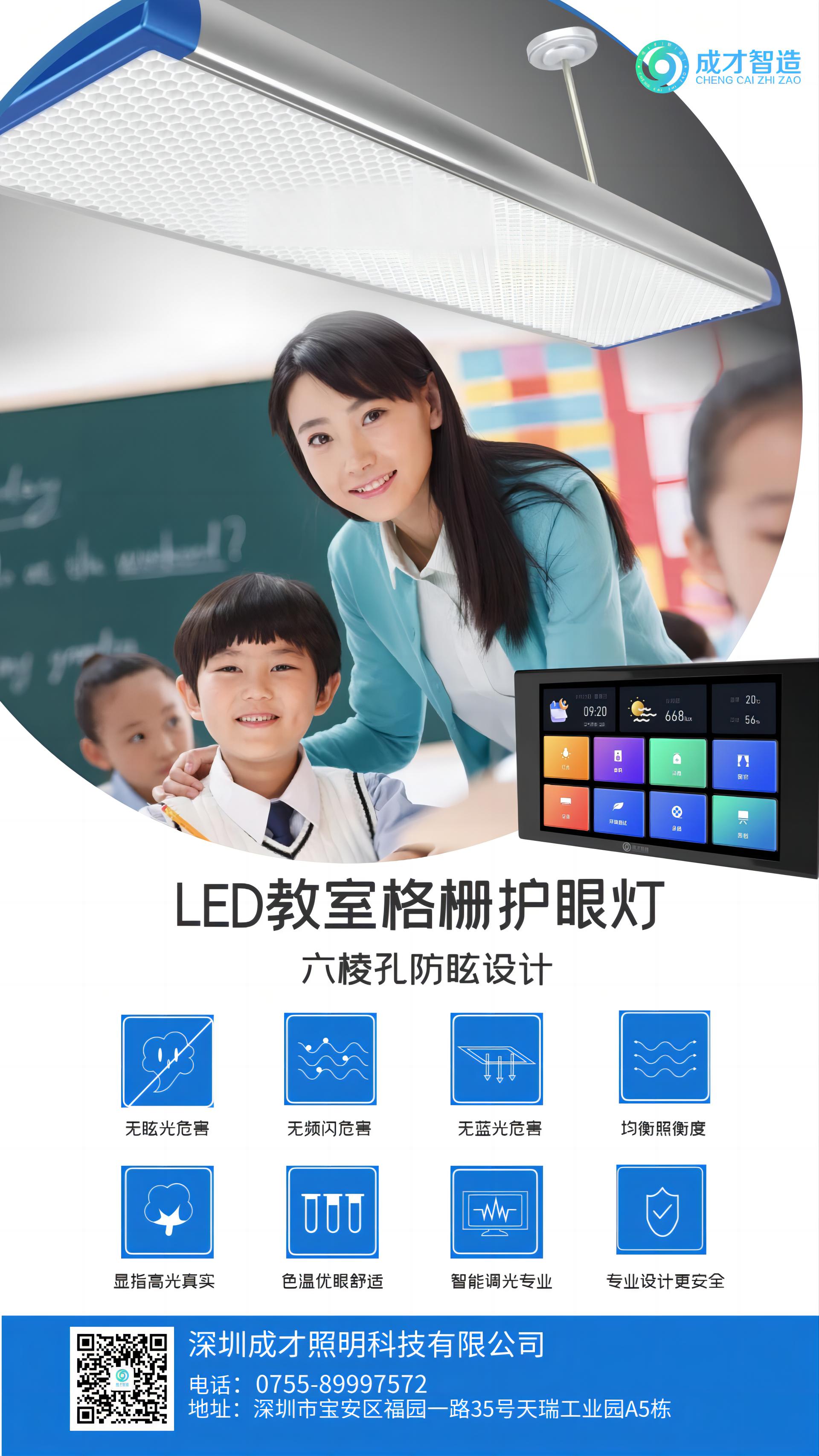 成才照明“9+3+2”的配置中各項(xiàng)照明指標(biāo)和殺菌指標(biāo)均高于國(guó)家要求,充分保障了教室照明的效果,以及學(xué)校對(duì)疾病的防疫需求,最大程度落實(shí)兒童青少年近視防控和疾病防控的目標(biāo)。