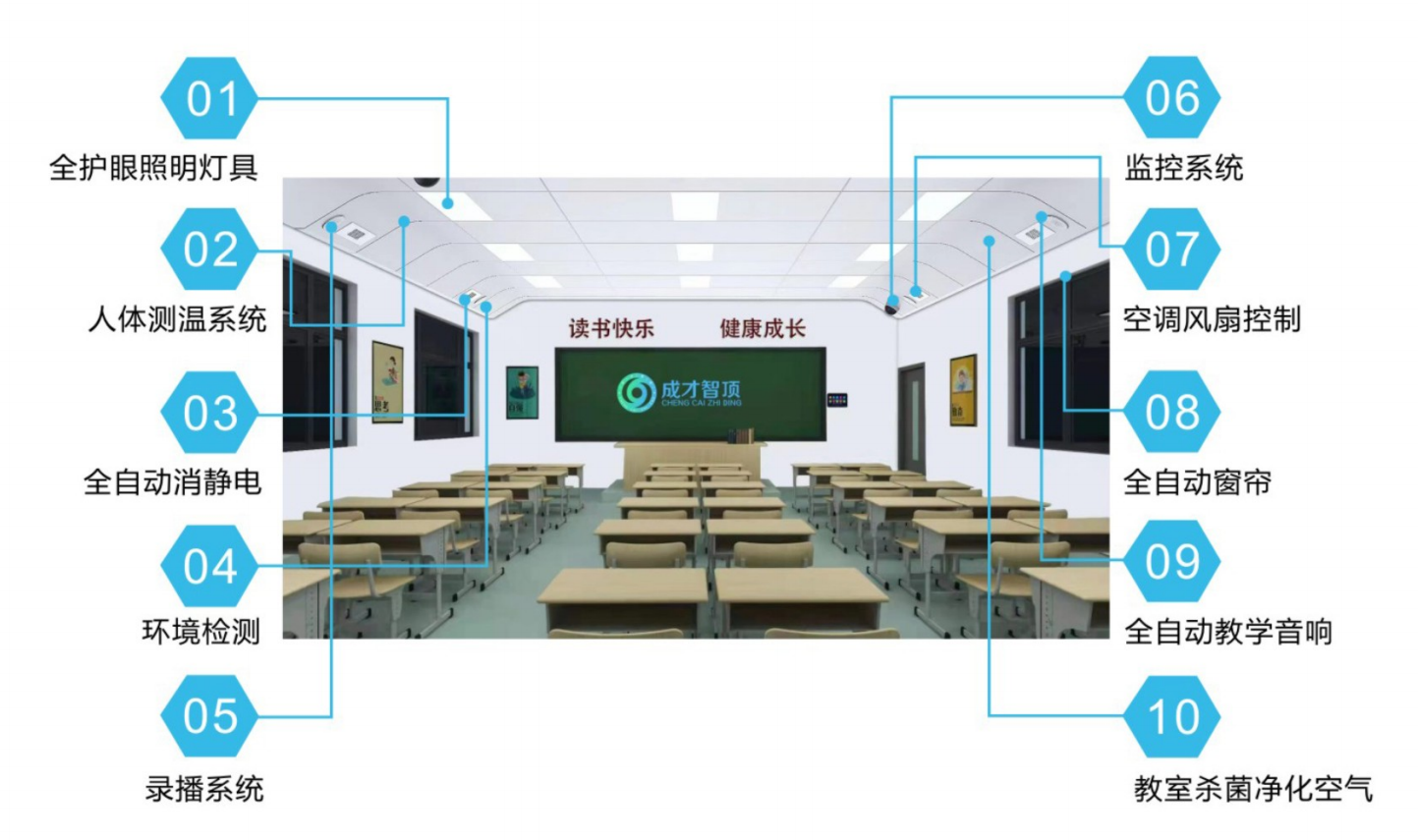 除此之外,成才智頂還實(shí)現(xiàn)了照明場(chǎng)景的?動(dòng)切換,以及對(duì)照明、 消毒、監(jiān)控、窗簾、空調(diào)?扇、錄播、體溫監(jiān)測(cè)、靜電消除、環(huán)境監(jiān)測(cè)等進(jìn)?智能管理。